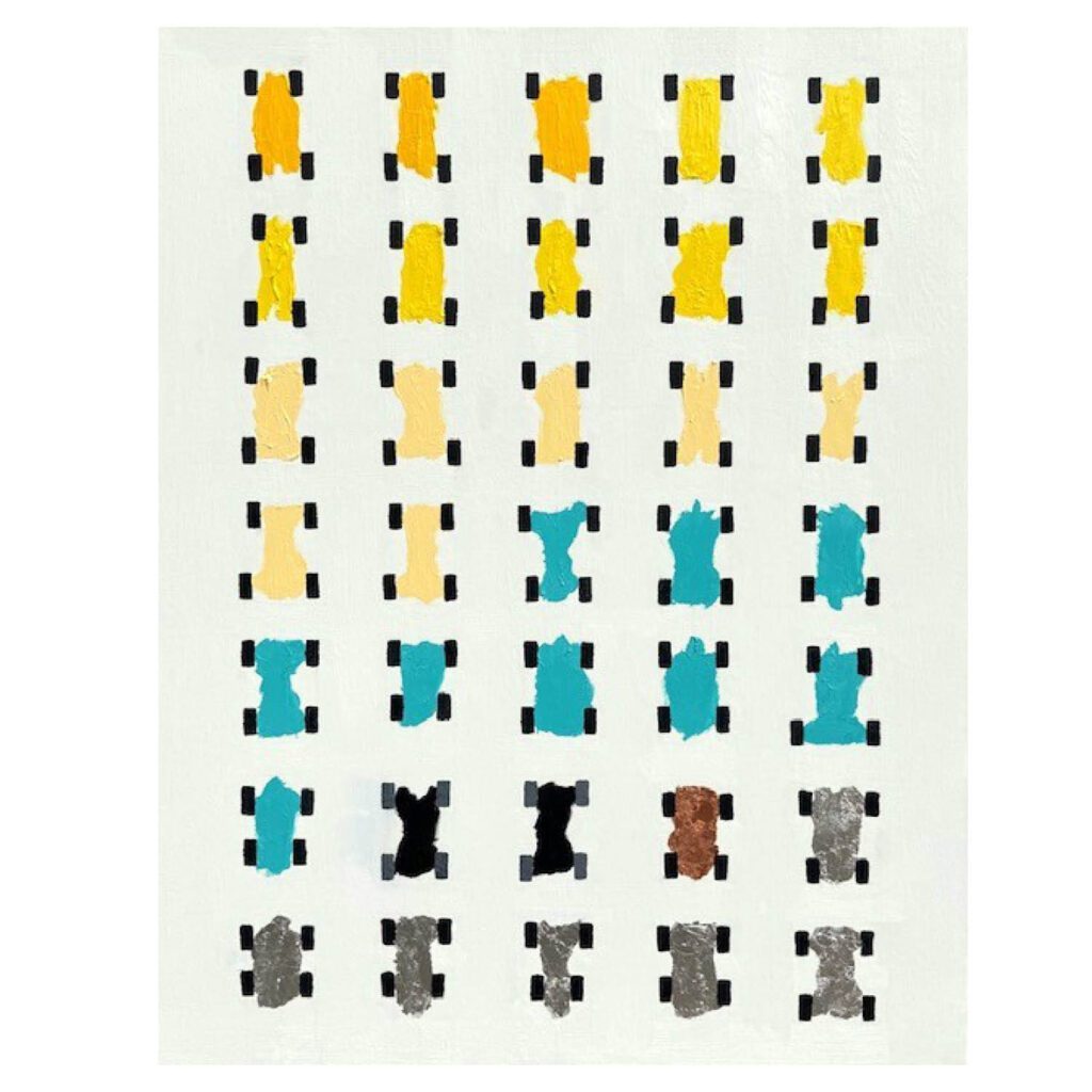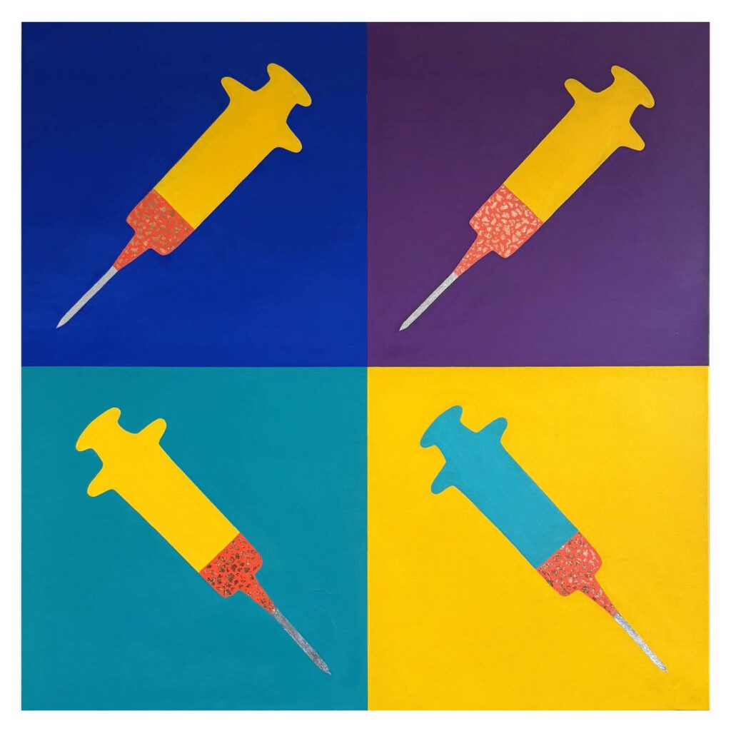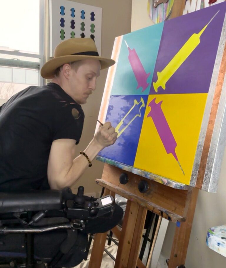As a child, Matthew spent hours organizing his toy cars, sparking a fascination with expressive color and shape, interests that continue to appear in his ‘Cars’ series. His pop art paintings incorporate personal objects, such as syringes, to symbolize healing, resilience, and identity. In his ‘Streams’ series, flowing and divided forms visually articulate the tension he experiences between the disabled and non-disabled worlds.