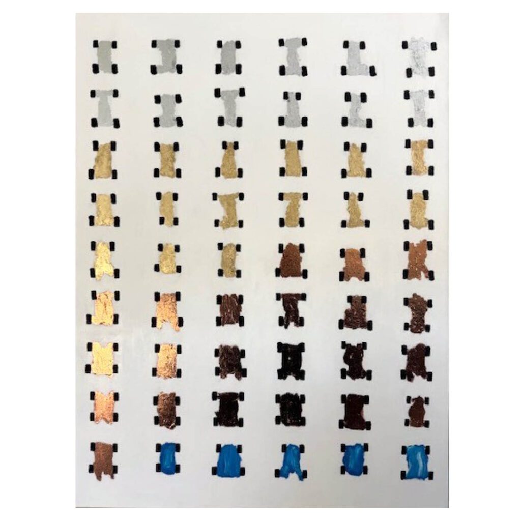 Oil paint, metallic elements like silver or copper, and found physical objects such as leaves. I’m drawn to the contrast between traditional painting materials and more unconventional elements that add dimension and symbolism.