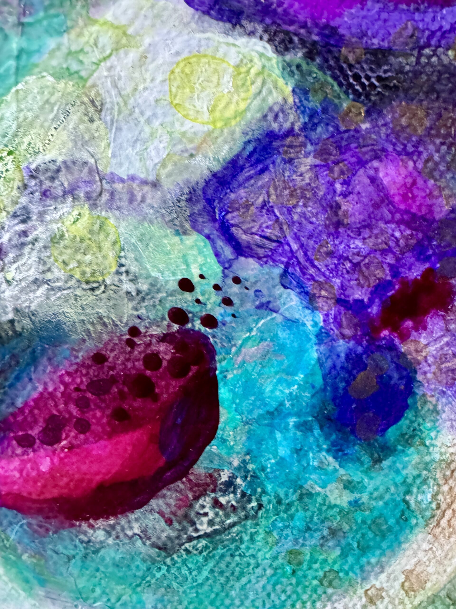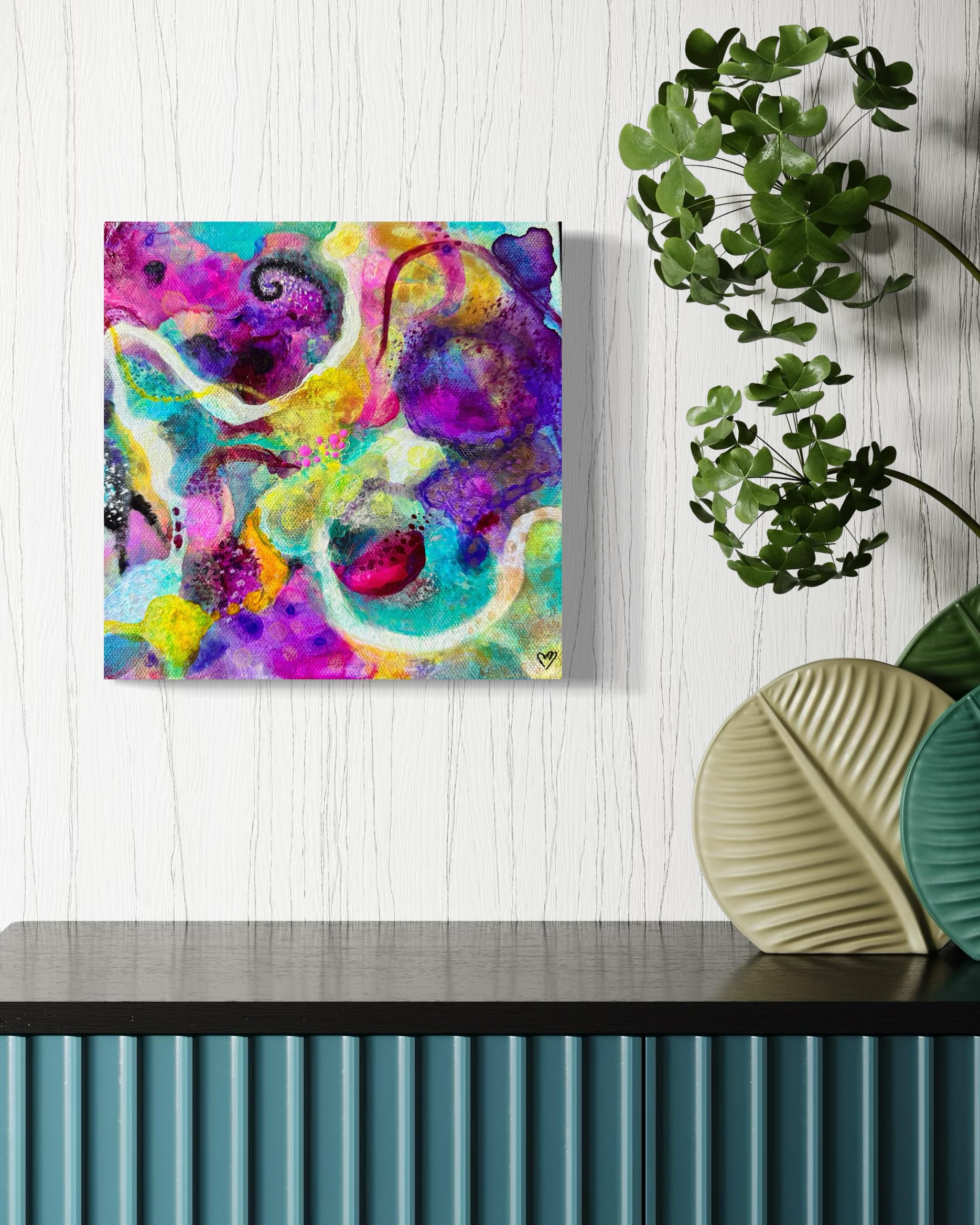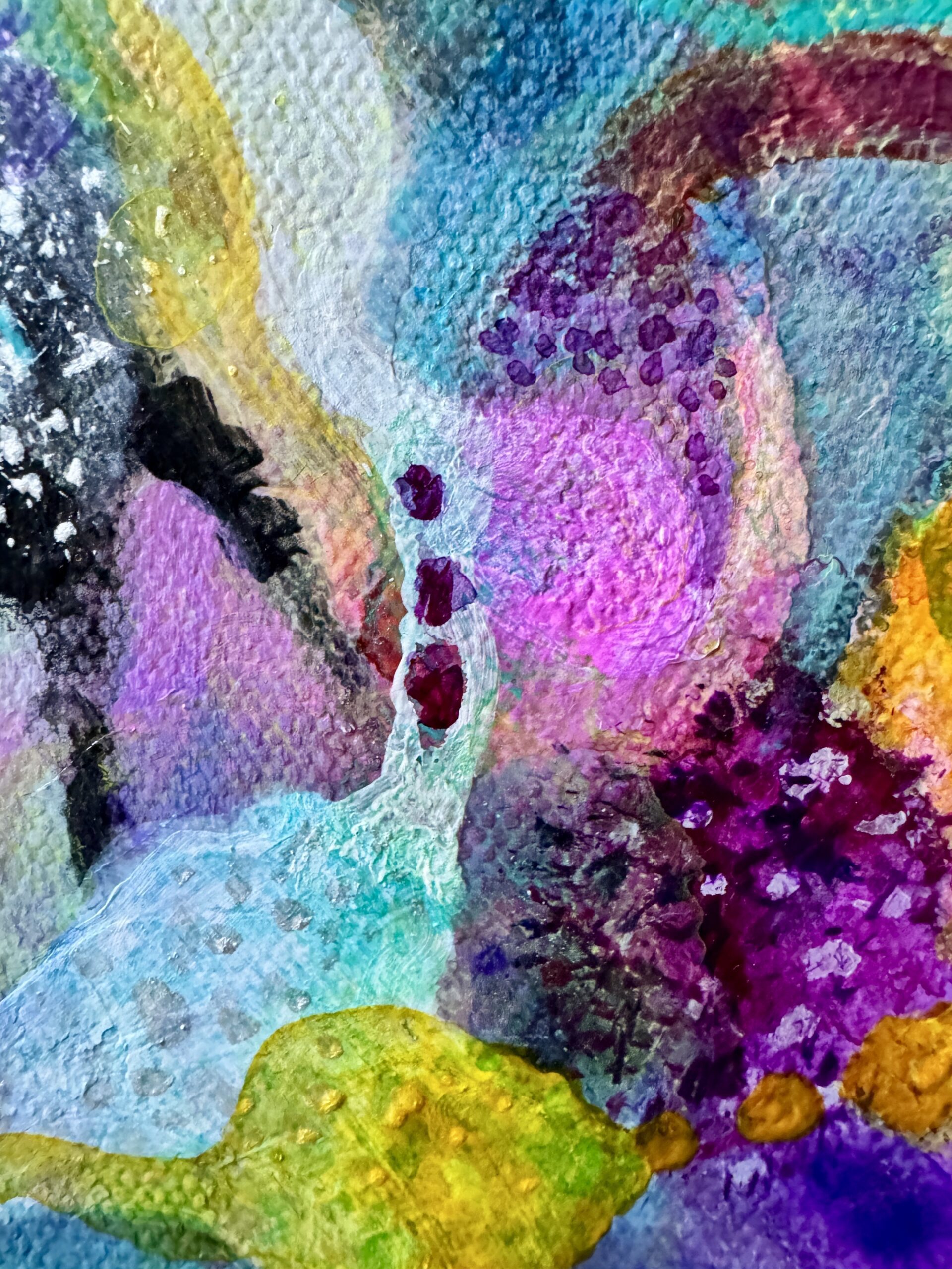 A burst of vibrant energy, Serendipity Zest is alive with bold movement and rich hues. Swirling turquoise, radiant magentas, golden yellows, and deep violets dance together in a playful explosion of color—pure joy on canvas!